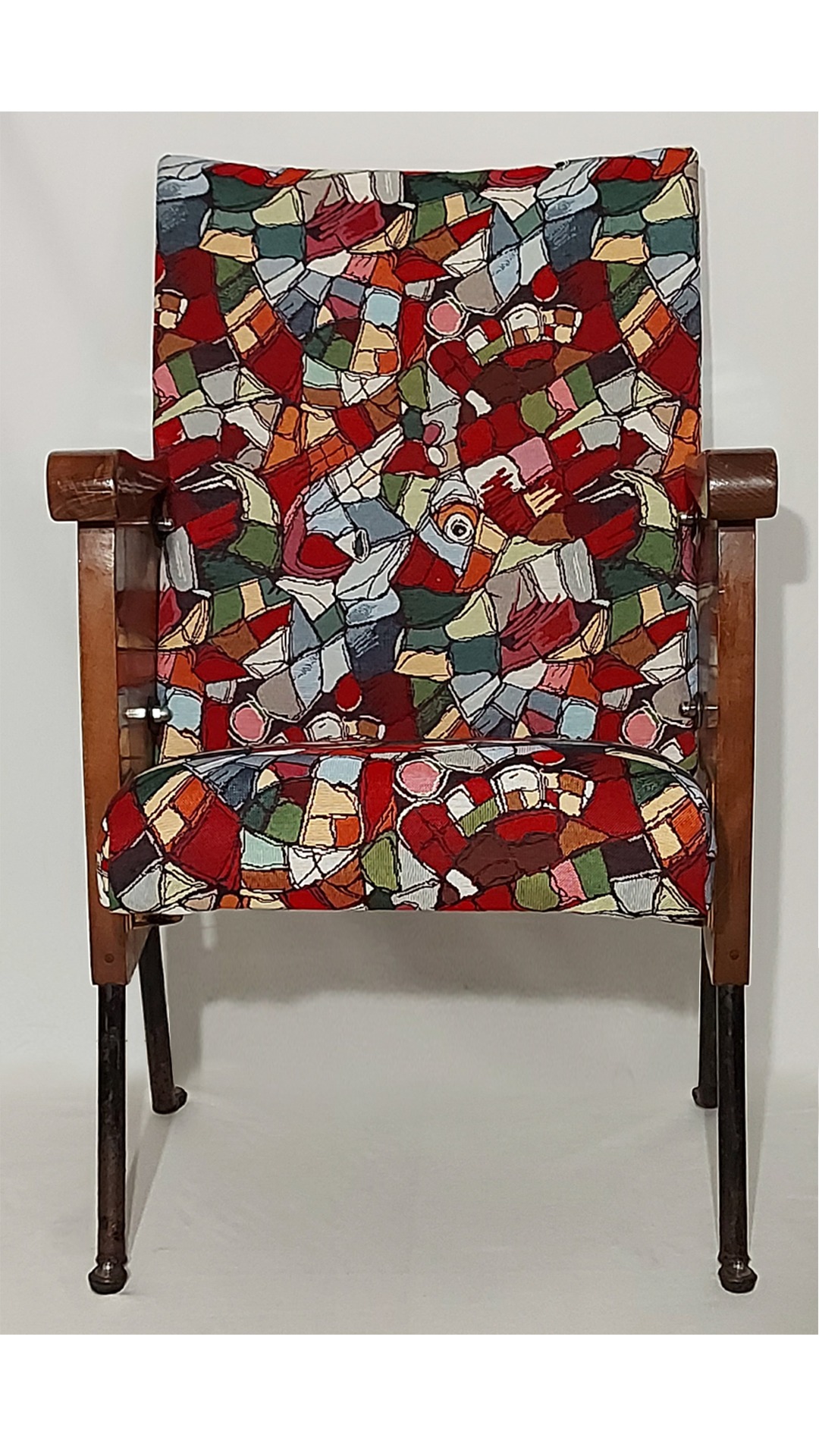 Coated with an abstract gobelin fabric, with a predomince for red, blue and black.
