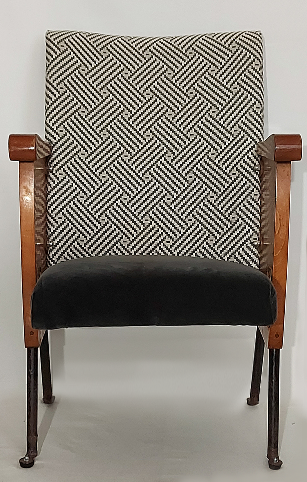 The back is coated with a black and white weft design gobelin fabric, the bottom part is coated in a dark gray cotton based velvet.